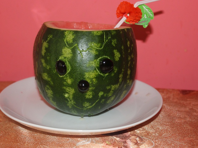 Берем маленький домашний арбузик, ложкой аккуратно выбираем мякоть, очищаем ее от семян. В чаше блендера измельчаем кусочки арбуза, мед, листья мяты на небольшой скорости. Затем осторожно добавляем йогурт и корицу. По желанию можно добавить лед!
